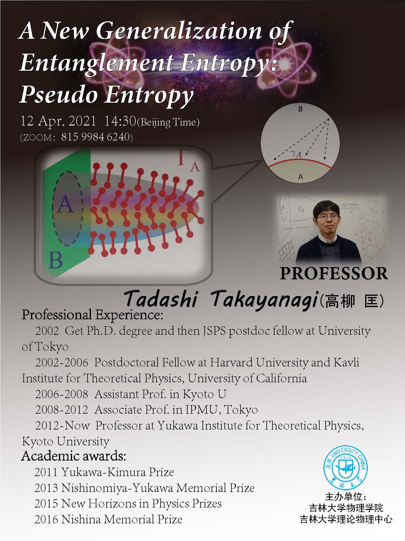 报告题目:A New Generalization of Entanglement Entropy: Pseudo Entropy