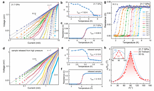2. OSAL SiP2的二维超导电性。高压样品及常压截获样品均呈现典型的Berezinskii-Kosterlitz-Thouless转变及显著的各向异性上临界磁场特征,其角度依赖的上临界磁场拟合结果与二维Tinkham模型一致。
