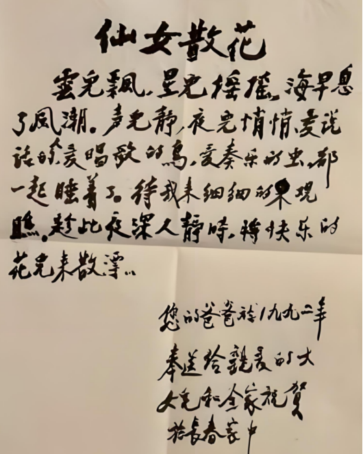 父亲性格乐观开朗,兴趣广泛。他喜爱唐诗宋词,看书累了便在书房里边踱步边用江西调吟诗,据说几乎能背《唐诗三百首》一半。我记得小时候他教我的第一首唐诗是王维的《鹿柴》:“空山不见人,但闻人语响。返景入深林,复照青苔上。”父亲偶尔也写诗。1984年春节,全家难得团聚,我们请父亲为每个小家庭用毛笔写一首自己的诗作纪念: